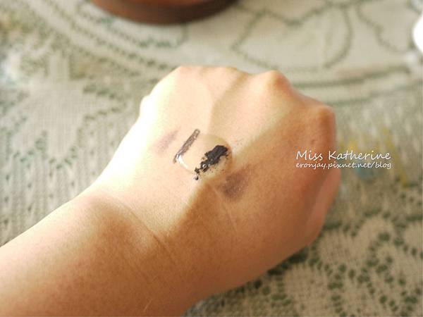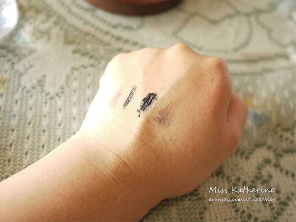 最後來測試眼妝,在手背上塗上了眉筆、眼線液、睫毛膏和眼影